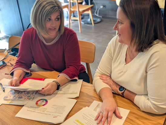 Pictured: Janel Binder (left) and Kelly Braswell (right) discussed LECN’s Comprehensive Health workgroup at Starbucks on 33rd and O Streets on December 17, 2025.